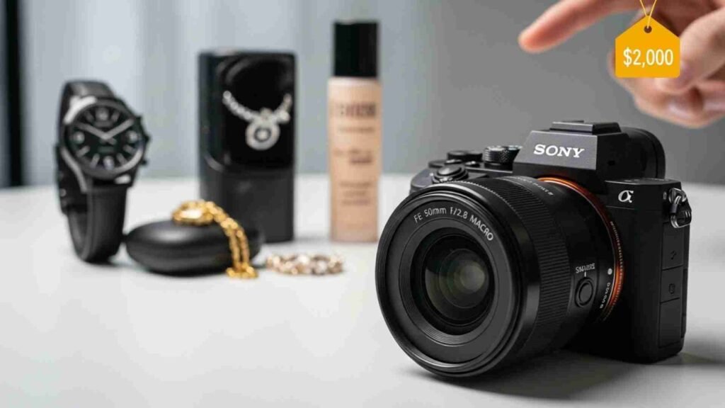 If the 90mm is out of budget, the Sony FE 50mm f/2.8 Macro is an excellent alternative. This lens gives you sharp, clean images and has powerful macro capabilities. It focuses extremely close and offers near distortion-free results, making it perfect for medium-sized products shot on a table.