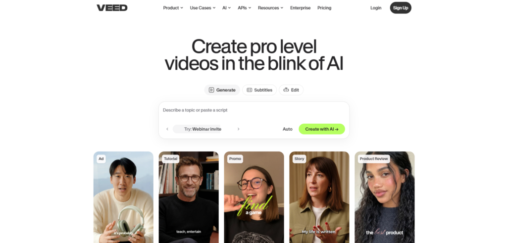 VEED.IO is a browser-based editor that has become one of the Best UGC Video Makers for Creating YouTube Shorts thanks to its AI-powered features.