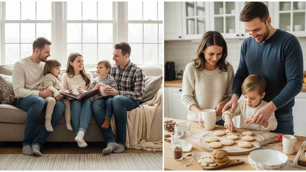 A living room with soft natural window light is one of the best setups. Families can cuddle on the couch, read books together, sip warm drinks, or simply talk and laugh. These lifestyle moments feel authentic and timeless. Children feel safe and relaxed in familiar environments, which leads to natural expressions and genuine interactions.