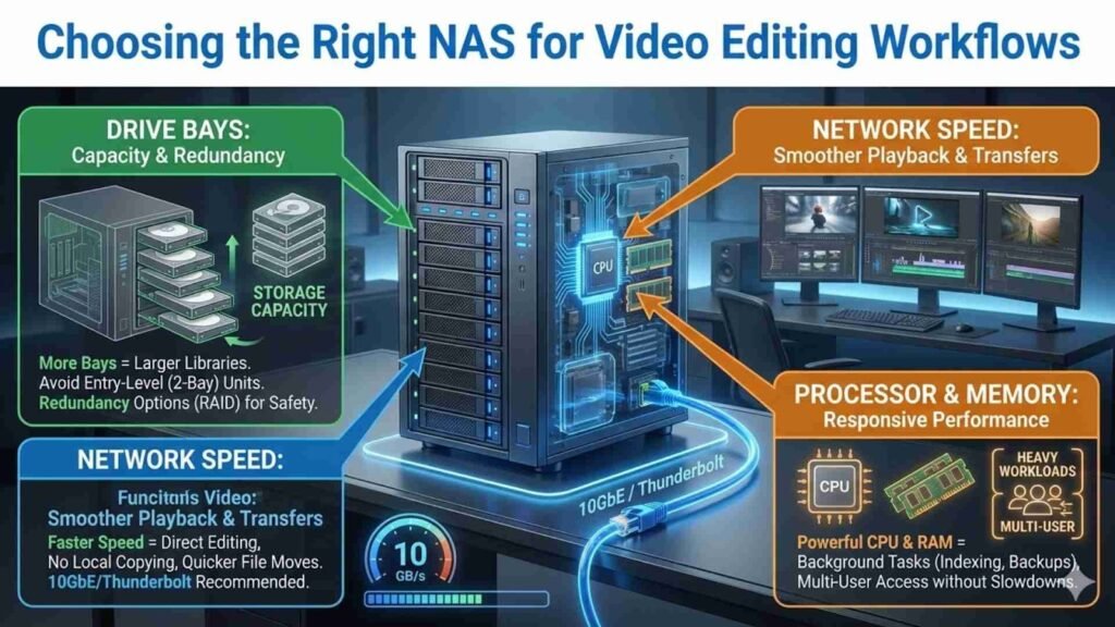 Network speed is another key consideration. A NAS with faster network support ensures smoother playback and faster file transfers. This is especially important if you plan to edit directly from the NAS rather than copying files locally.
