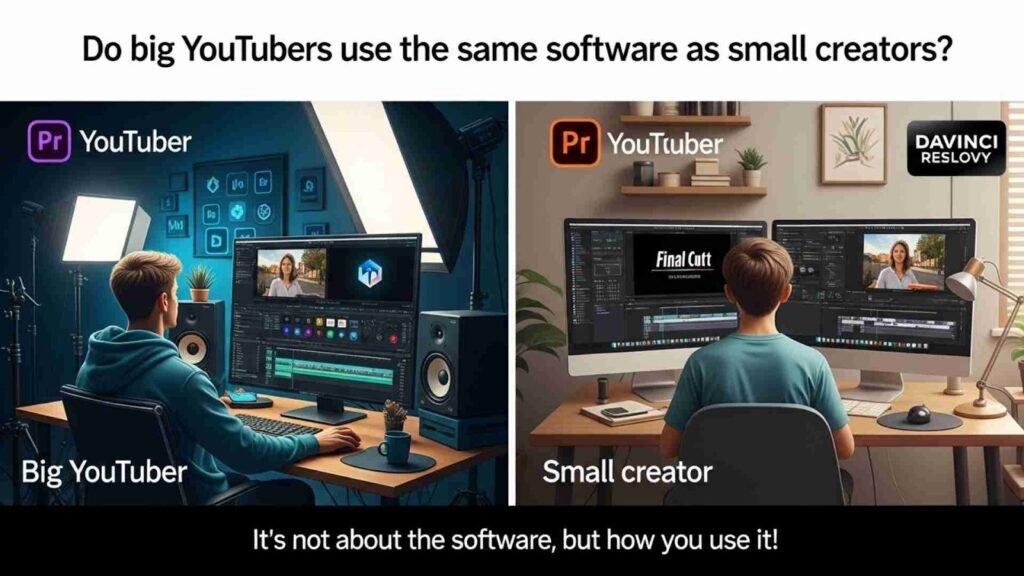 The real difference lies in experience, plugins, storytelling, lighting, and sound – not in secret editing programs. Many large channels use Adobe Premiere Pro, Final Cut Pro, or DaVinci Resolve exactly like millions of smaller creators. They simply know how to use these tools deeply and efficiently.