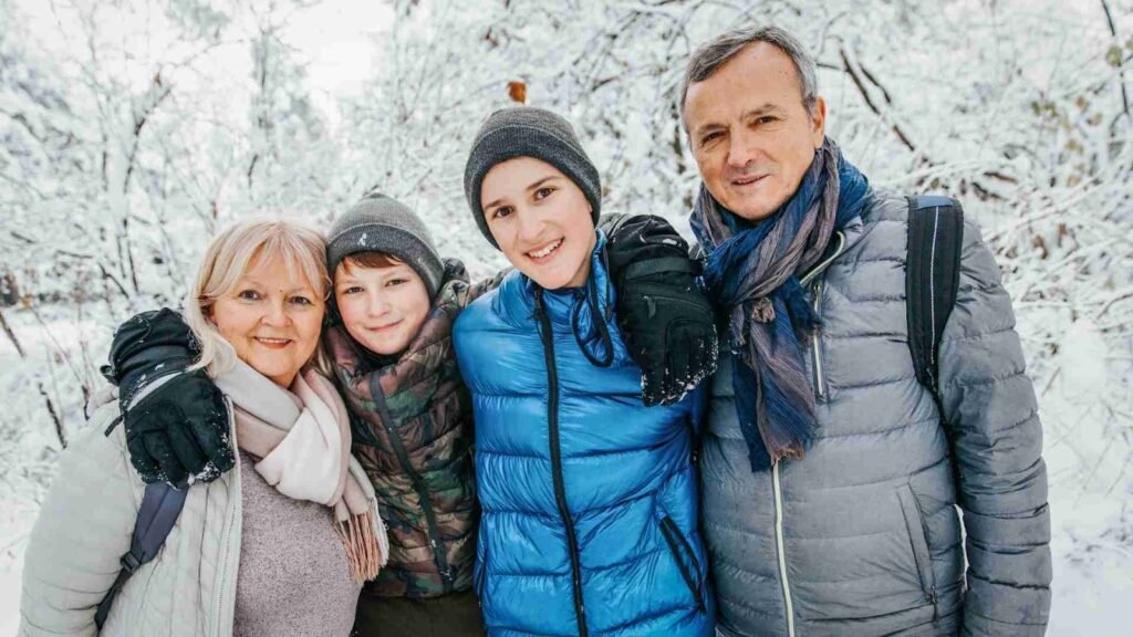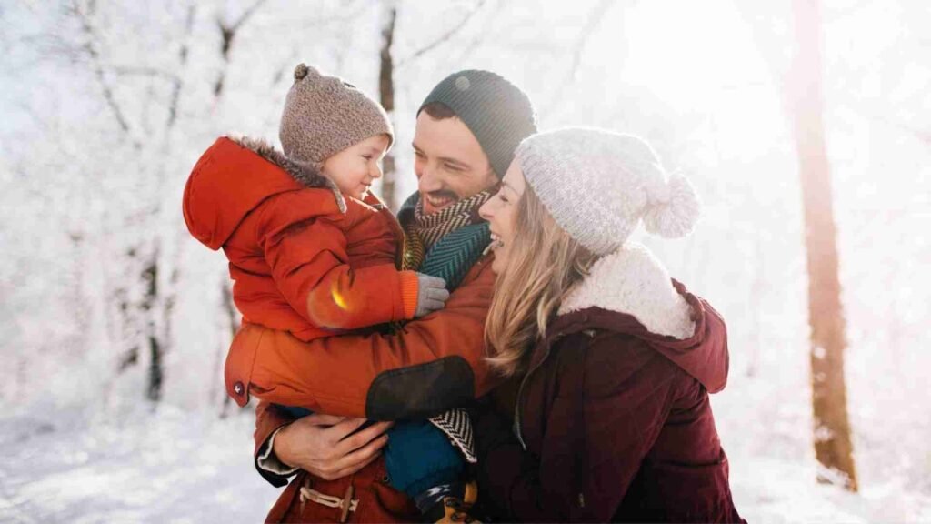 Choosing the right winter family photo color schemes helps your entire photoshoot feel cohesive and visually balanced. Winter backgrounds-snow, pine trees, twinkle lights, indoor fireplaces-can either complement or compete with your clothing. When you choose colors intentionally, your family becomes the natural focus of every image.