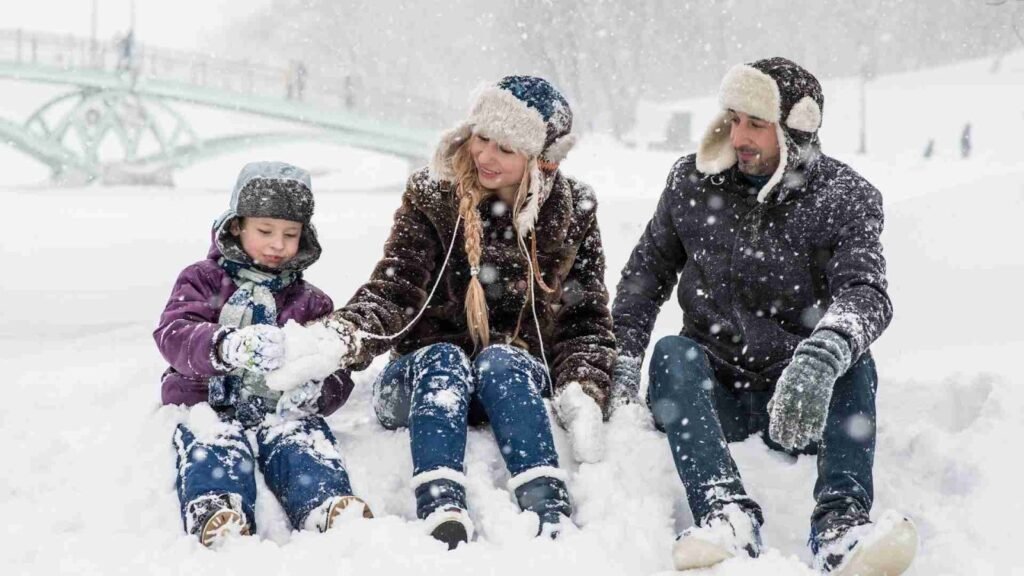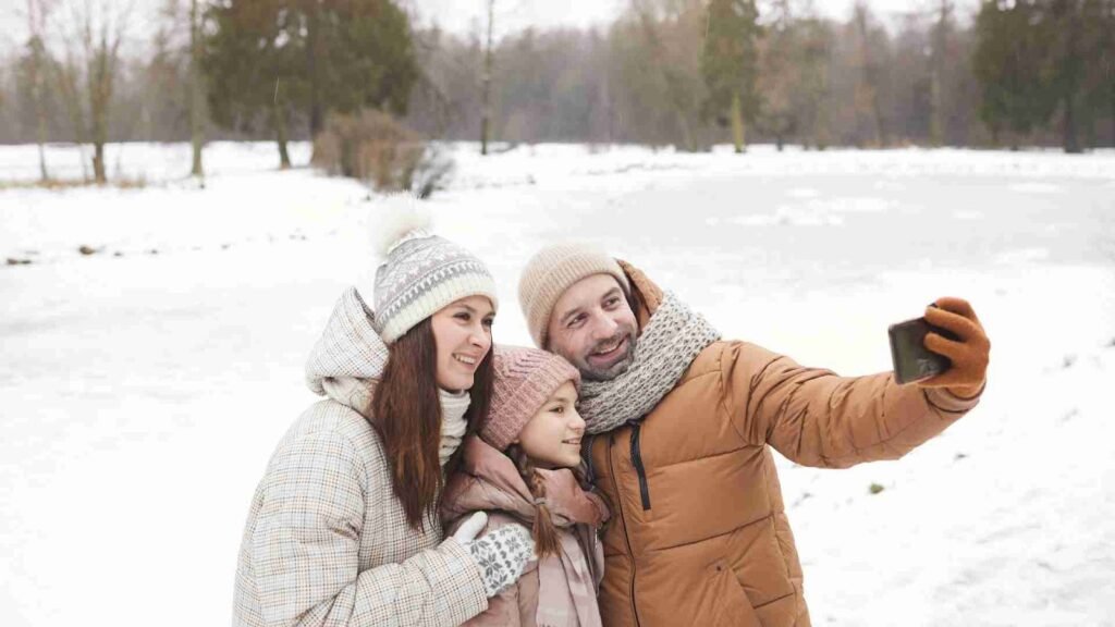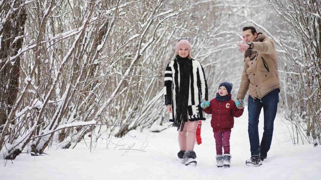 Imagine a family surrounded by tall pines covered in soft snow. The best winter family photo outfits here include textured sweaters, wool coats, and earthy accessories. Think caramel boots, forest-green sweaters, cream scarves, or rust-colored hats. The tones blend with nature, creating a cozy, rustic style.