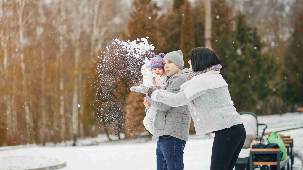 Some families prefer a clean, modern aesthetic. For this, choose all-white, off-white, cream, and soft gray outfits. The result is dreamy and elegant. Soft colors blend with snow and create timeless images. Add texture through knits, cable sweaters, and light wool coats.